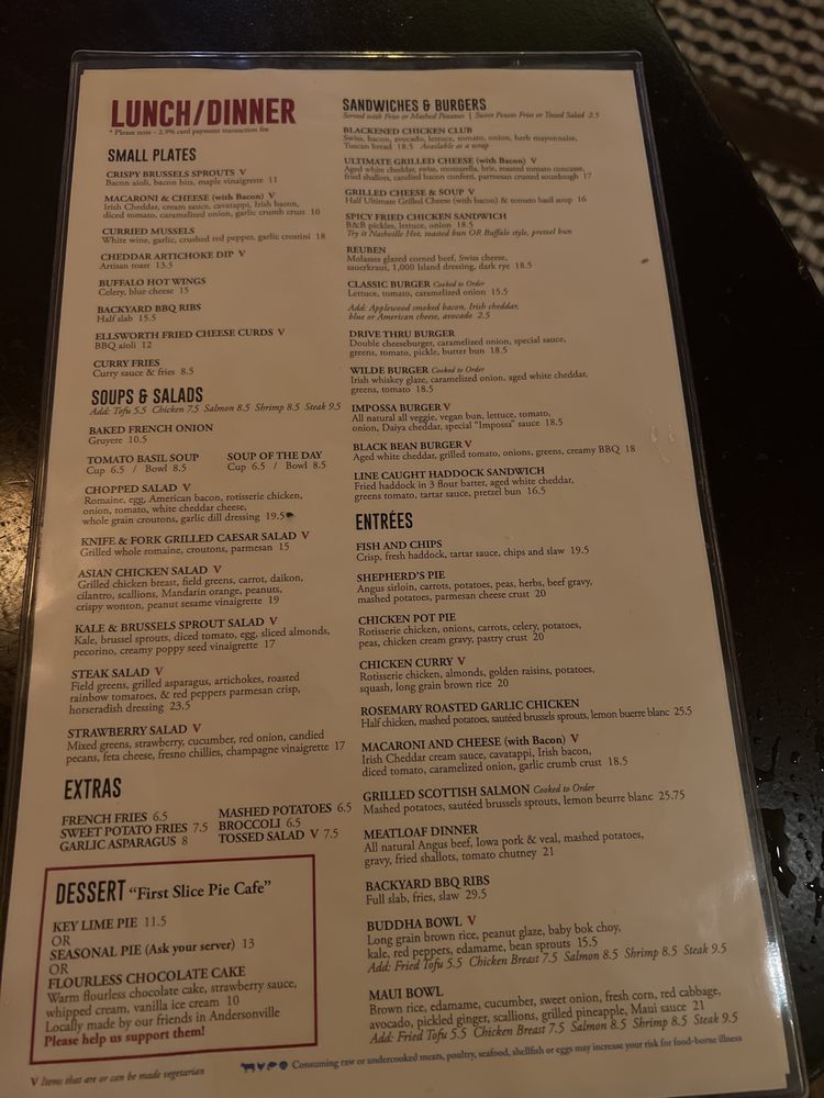 Introducing Wilde Bar & Restaurant, located in Chicago, a vibrant Irish pub with a cozy and viby ambiance. This restaurant offers a variety of options such as salads like Asian Chicken Salad and Kale Brussels Sprouts Salad, small plates including Backyard BBQ Ribs and Ellsworth Fried Cheese Curds, and soups like Baked French Onion Soup and Mulligatawny. Customers rave about the comforting hearty Irish foods and the incredible curry mussels. The atmosphere is described as reminiscent of Frank Sinatra, with attentive wait staff. The menu is diverse, catering to large groups and intimate dates alike. Must-try items include the crispy Brussel sprouts, curry fries, and cheese curds. Wilde Bar & Restaurant is the perfect spot for a memorable dining experience with delicious food and excellent service.